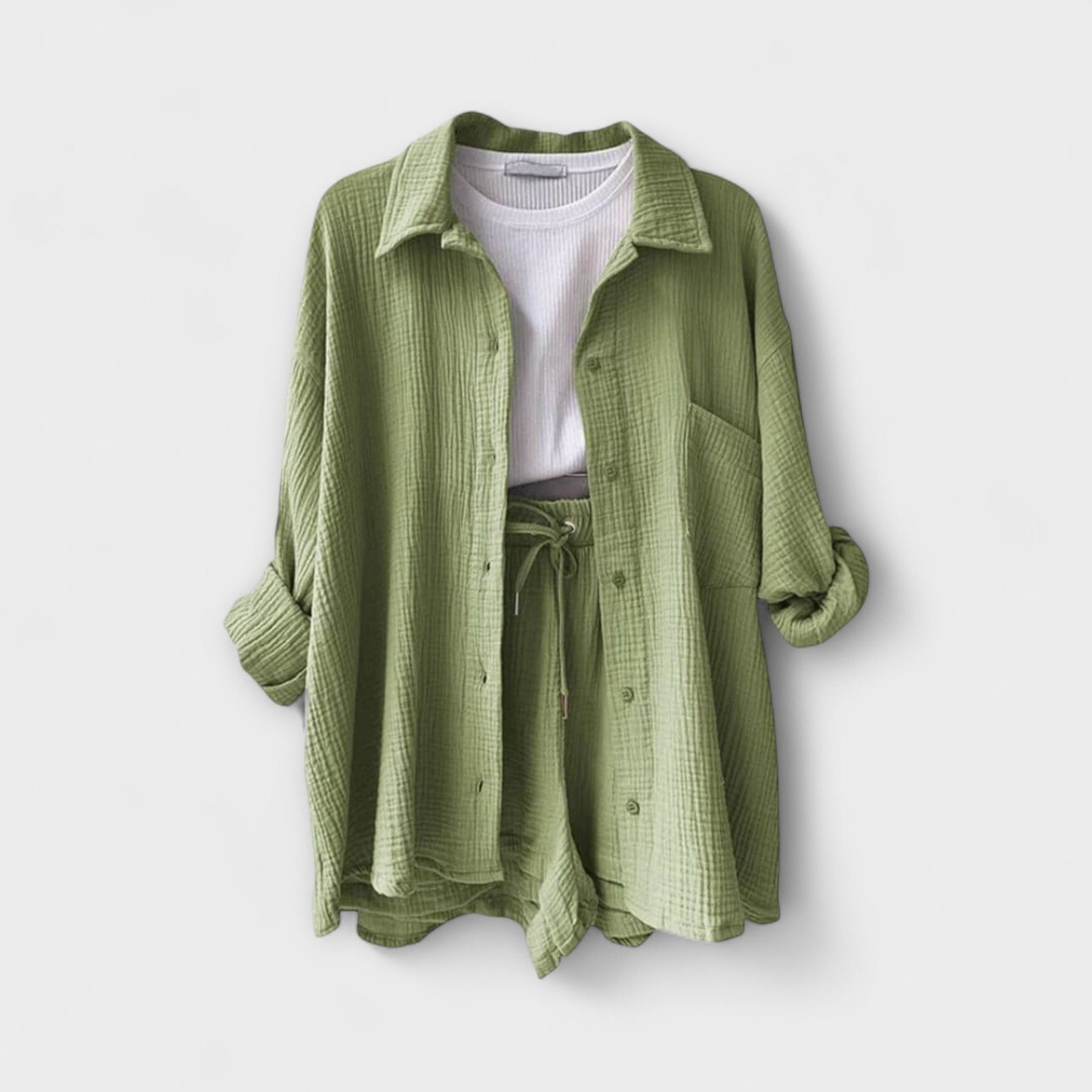 Hyväksy vaivaton eleganssi tällä kaksiosaisella setillä—suunniteltu lämpimille säille ja tarkoitettu tarjoamaan sekä tyyliä että mukavuutta kaikissa ympäristöissä.